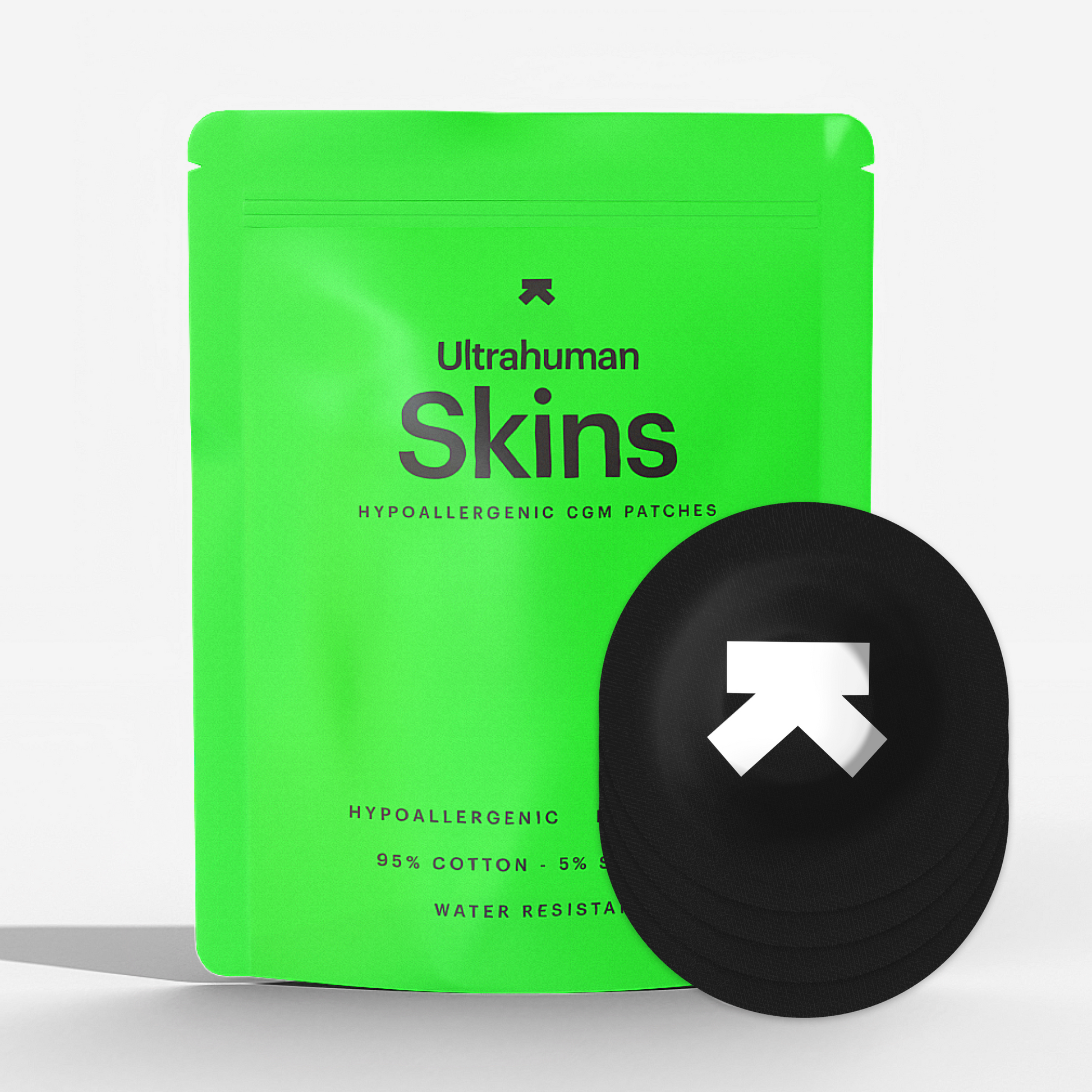 Ultrahuman Skin is a protective over bandage with a hypoallergenic adhesive tape that protects your sensor from daily abrasions and knocking off due to excessive movement. This comes in a pack of 20 skins.